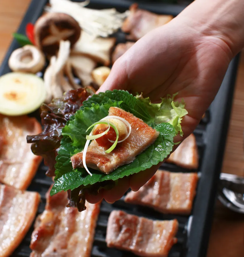 • The Assembly: Take a lettuce or perilla leaf, place a piece of meat in the center, and add grilled garlic and Pajeori (seasoned scallion salad).
