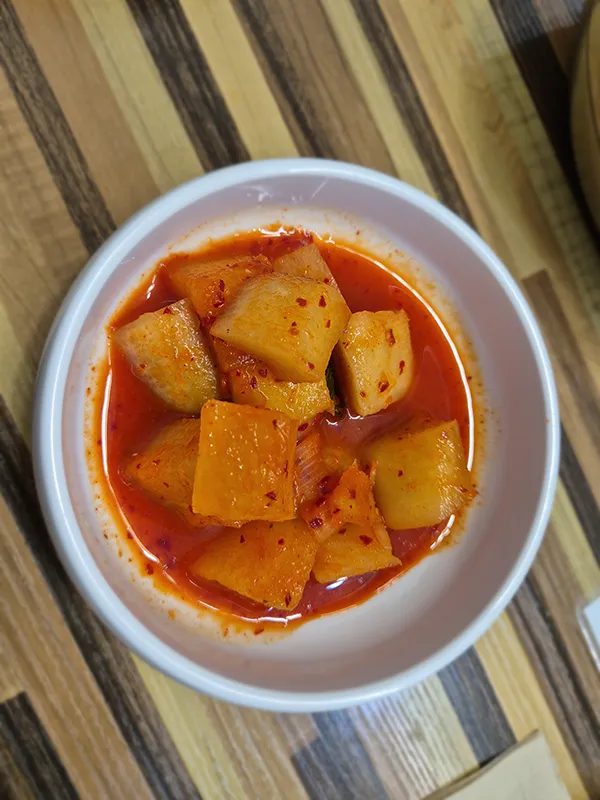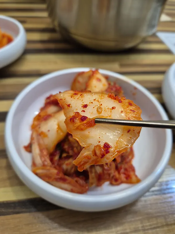 The pro move here is the layering. Take a piece of the pork, dip it lightly in the salted shrimp (Sae-u-jeot), and place it on a crisp napa cabbage leaf. Top it with their signature house-made Geotjeori (Fresh Kimchi) and a slice of spicy radish. The crunch of the fresh kimchi combined with the buttery richness of the pork creates a “Flavor Bomb” that is both earthy and decadent. It is simple, rustic, and absolutely world-class.