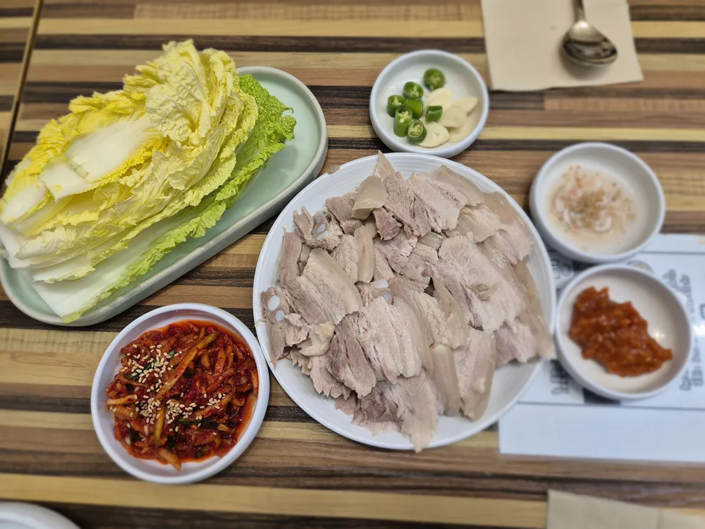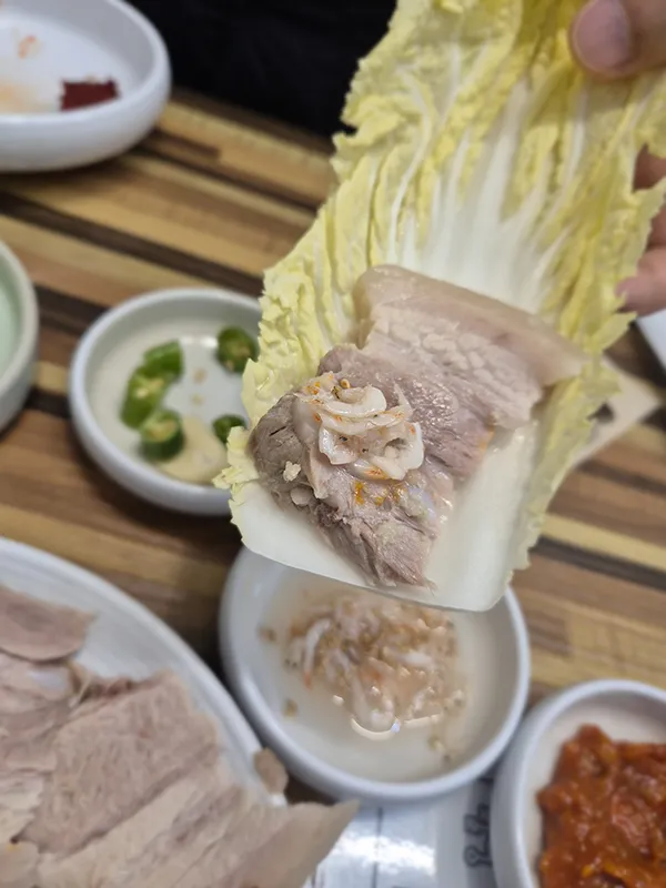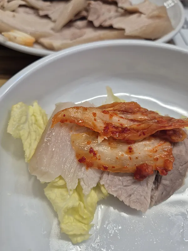 “”The fresh Geotjeori kimchi is so addictive, you’ll want to buy a jar to take home—but the true magic happens when it meets the succulent Bossam pork.””
